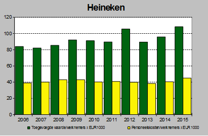 De omzet per werknemer schommelt niet heel erg. Aan deze getallen valt weinig af te lezen, behalve dat het vrij constant is ieder jaar. Het aantal werknemers is wel een stuk hoger dan in de jaren 2008 tot en met 2011. Dit geeft wel weer aan dat de omzet ongeveer gelijk groeit met het aantal werknemers. De arbeidsproductiviteit daarentegen is dus niet gestegen onder de werknemers van Heineken.