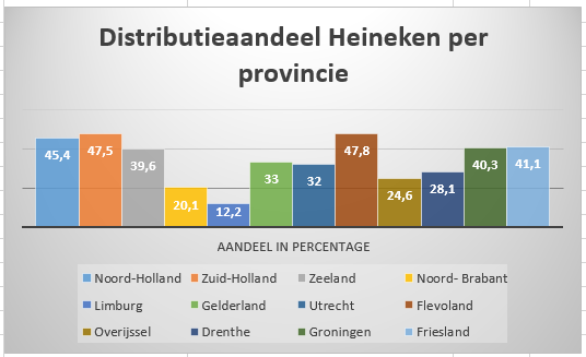 De distributieverspreiding in Nederland is goed, Heineken is een bekend merk en is in alle hoeken van het land beschikbaar. In Limburg doet Heineken het bijvoorbeeld het slechtst en in Brabant het best. Heineken heeft in 8 provincies een marktaandeel dat hoger is dan 30% wat een hele goede score is.