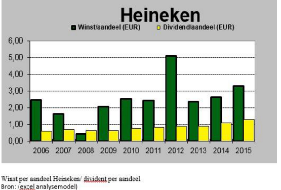 rond de € 0,90. In 2015 bedraagt het dividend op aandeel € 1,30. Het aandeel Heineken levert dus steeds meer dividend voor de aandeelhouders op.