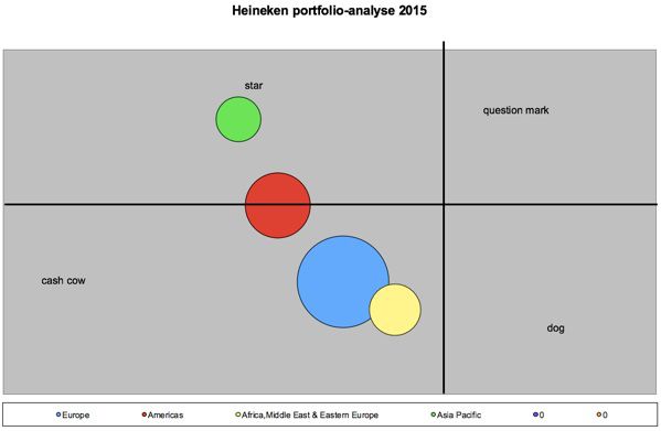 Hieronder zijn de markten van Heineken te zien. Veel markten bevinden zich in de Cashcow kwadrant. Als je het vergelijkt met het portofolio analyse van 2012. Is te zien dat Azie zich nog steeds in de star kwadrant bevindt. Wel is de cirkel groter geworden,dit betekend dat ze een grote markt aandeel hebben gekregen. Wat opvalt is dat de markt Europa groter is geworden, deze markt zat richting het kwadrant dog. Dit heeft ook te maken met het splitsen van Europa. Doordat de golf van Azie zal blijven groeien en de mark van Europa naar verwachting zal afnemen, zal de winst van Heineken ongeveer hetzelfde blijven.